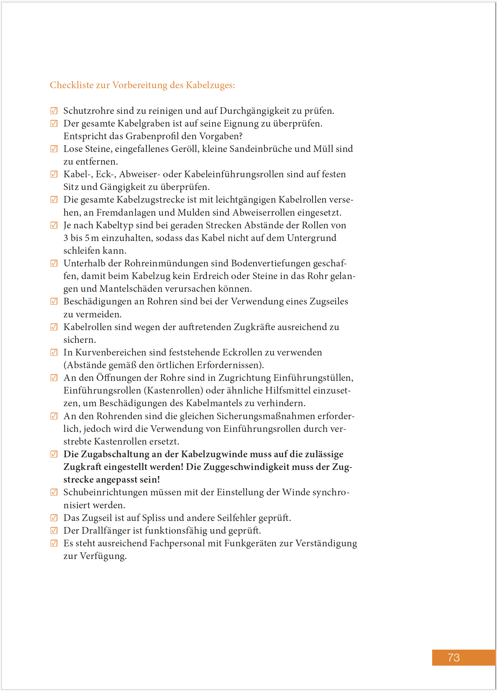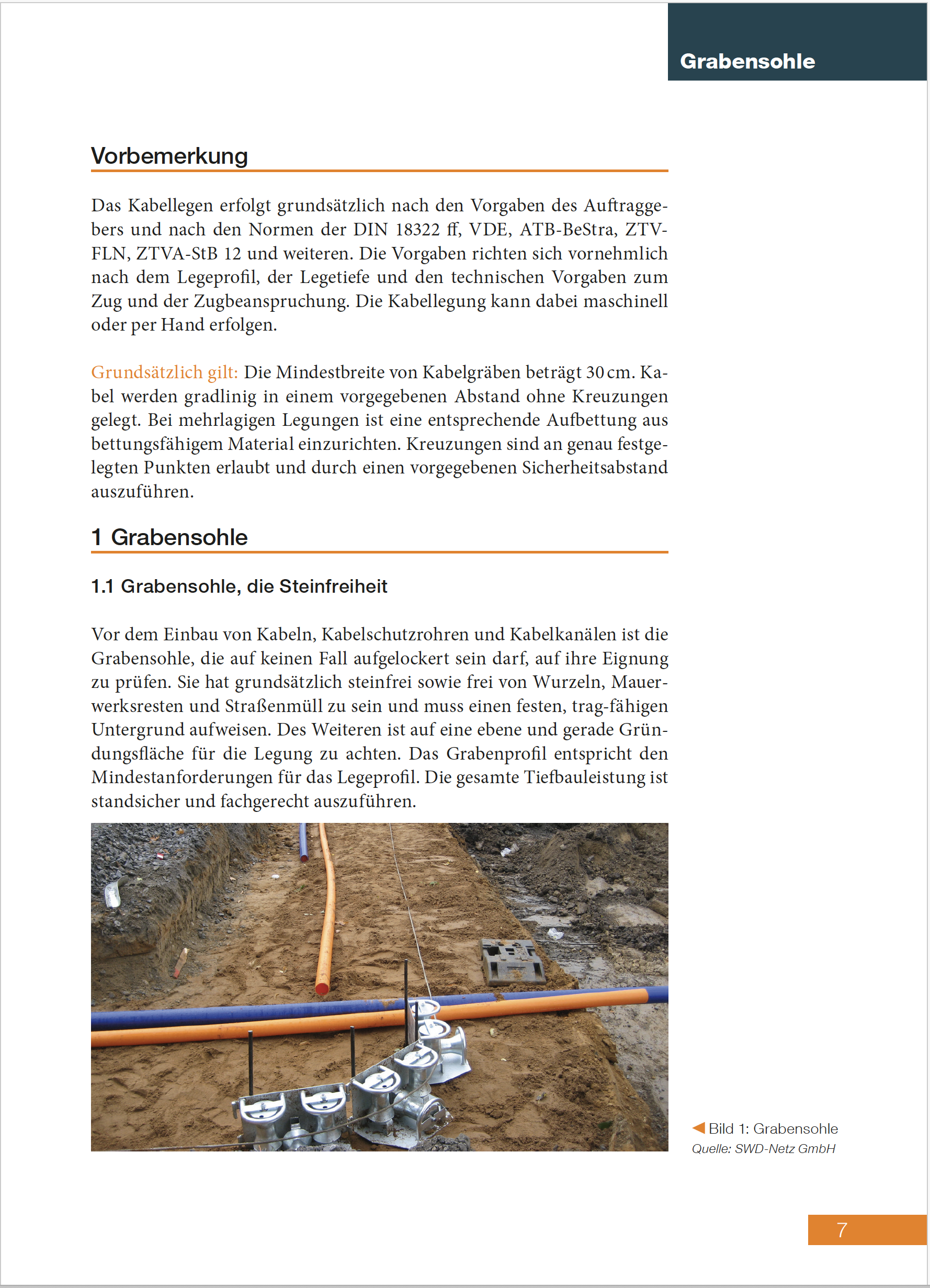 Das Handbuch ist für Bauleiter des Auf­tragnehmers und des Auftraggebers ein Leitfaden für Qualitätssicherung im Kabel­leitungsbau. Es hilft auch als Nachschla­gewerk, Lösungen bei verschiedensten Aufgabenstellungen zu finden. Für den Außenstehenden und den Lernenden im Leitungsbau ist es ein Hilfsmittel, das zur Vertiefung der vielfältigen Arbeitsgänge der Kabelleitungsbauarbeiten dient. Umfang­reiche und mit Bildern und Fotos illustrier­te Erläuterungen zu Materialien, Verfah­ren, Techniken und Geräten, sogenannte „So-nicht-Darstellungen“ sowie prägnant herausgestellte Hinweise machen dieses Buch zu einem wichtigen Begleiter in der Praxis des Kabelleitungsbaus.